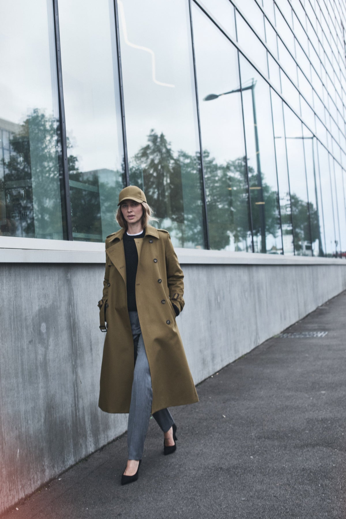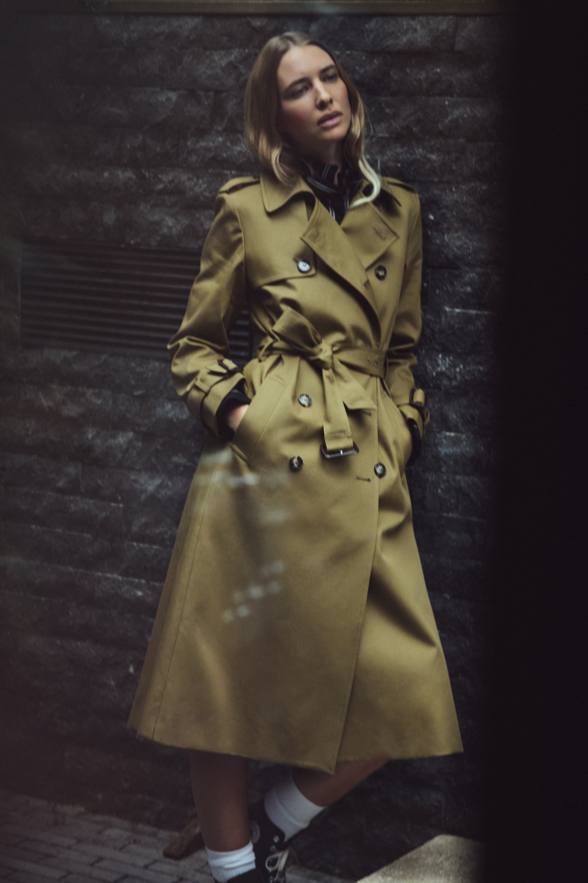 La coupe du trench a été étudiée pour être ajustée et ceinturée, soulignant la silhouette avec justesse sans jamais contraindre le mouvement.